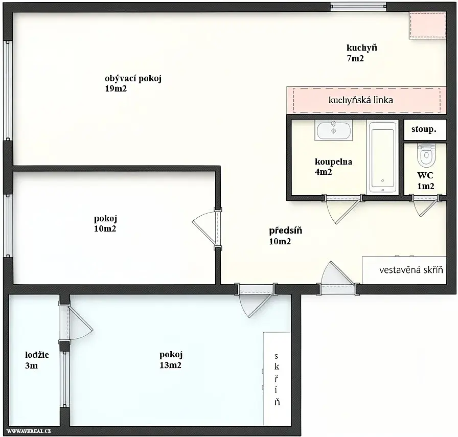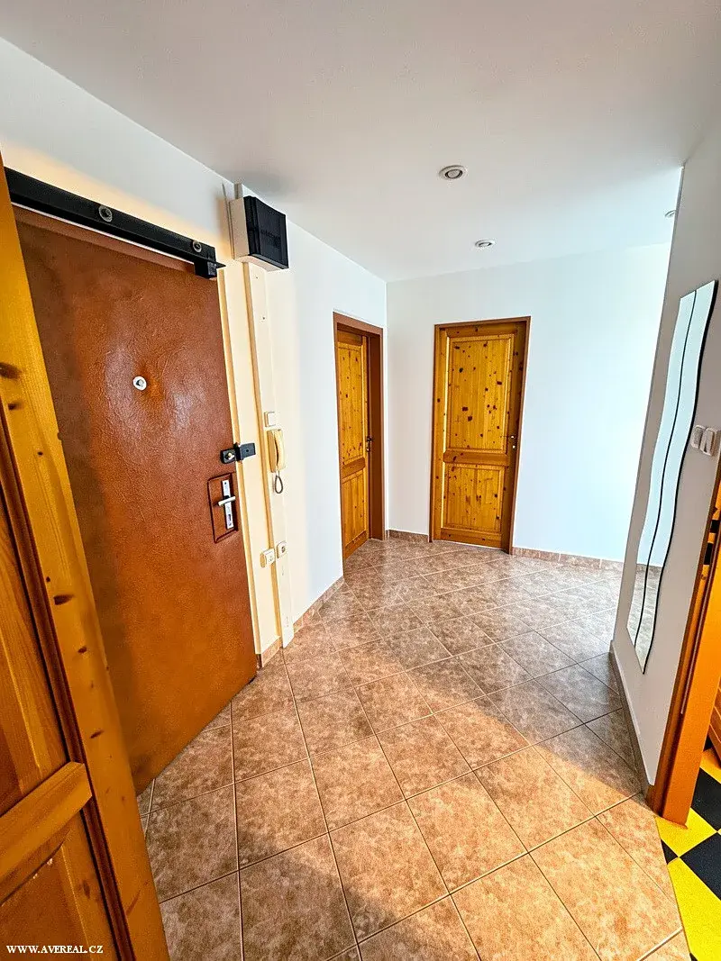 Dispozice je velmi funkční: tři samostatné neprůchozí pokoje, prostorná kuchyně, koupelna s vanou a samostatné WC. Velkou předností je zasklená lodžie s příjemným výhledem, která dodává bytu klidnou atmosféru.