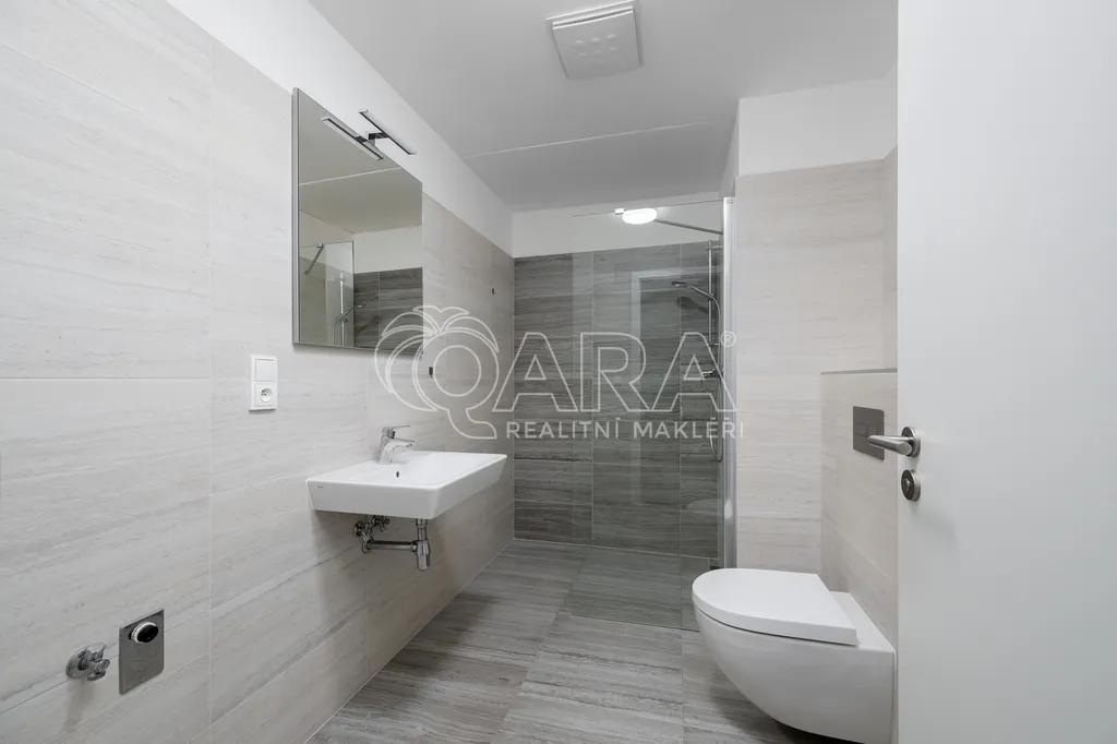 Prostorná koupelna je spojená s toaletou a disponuje sprchovým koutem walk-in. WC je závěsné. Je zde místo i pro pračku a sušičku. Na stěně je osazen topný řebřík.