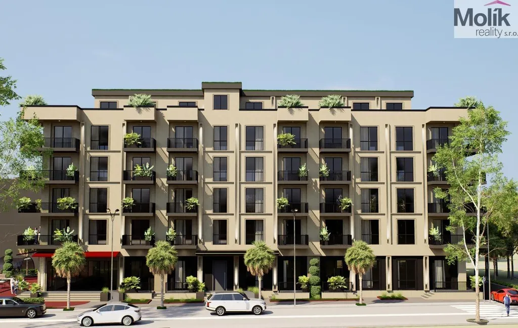 Design: Fasáda v přírodních tónech doplněná o černé kovové prvky a integrovanou zeleň na balkonech.