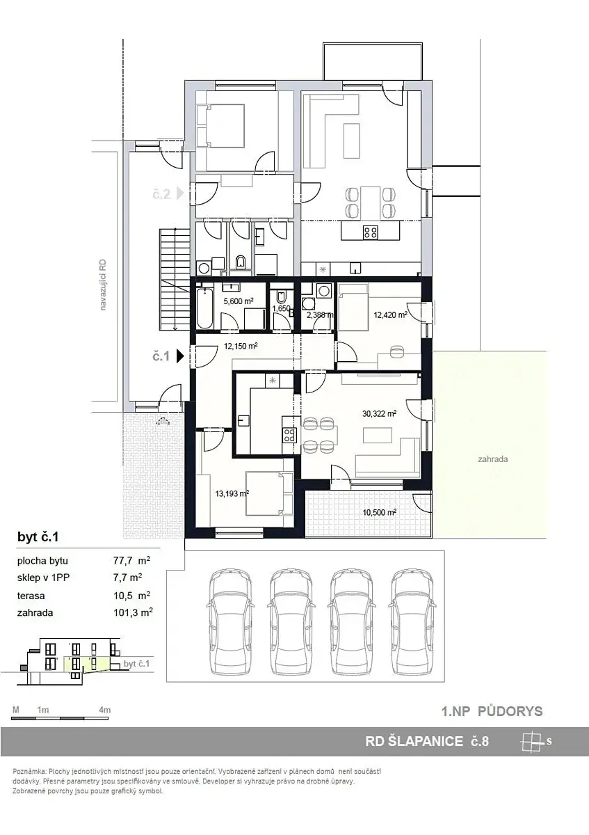 Nabízíme k prodeji byt 3+KK s terasou 10,5m2, zahradou 101,3m2, sklepem 7,7m2 a 1 parkovacím stáním.