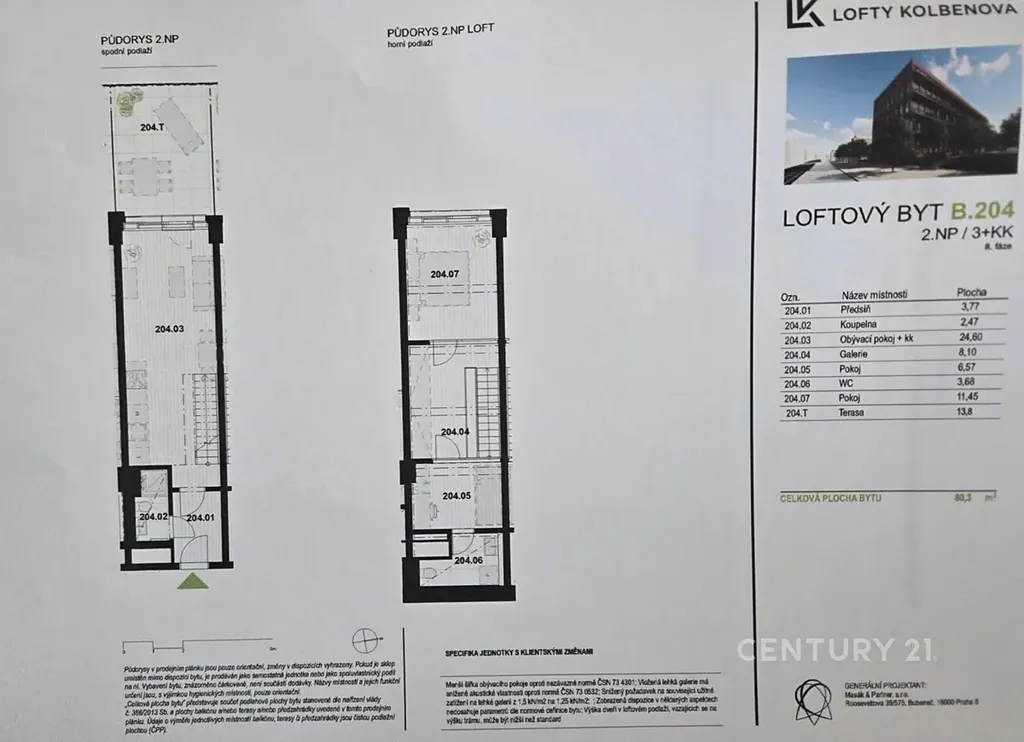 Celková plocha bytu činí 80 m² včetně terasy o velikosti 13,8 m². Samotná užitná plocha bytu je tedy 66 m².