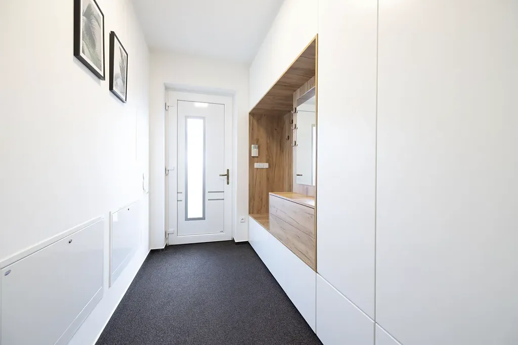 V celém domě je teplovodní podlahové vytápění a hlavní dominantou obývacího pokoje s kuchyní je potom rohový krb značky Hoxter, který vytopí celou obytnou část domu.