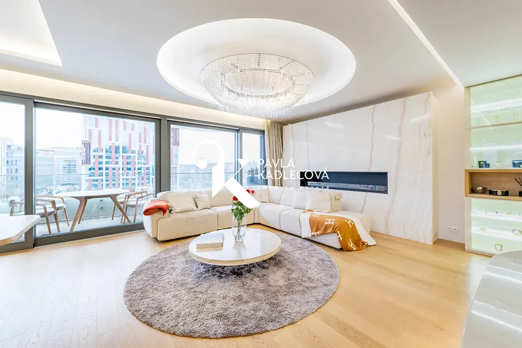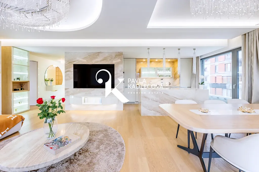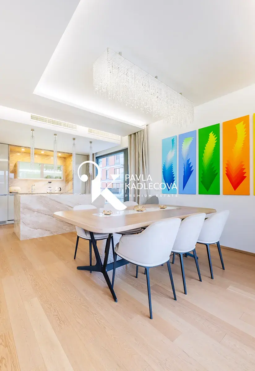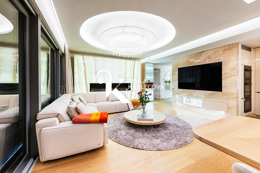 Dominantou bytu je otevřený obytný prostor s kuchyní, jídelnou a obývací částí, který je díky celoproskleným plochám zaplaven denním světlem a přirozeně se propojuje s terasami o celkové ploše 32 m². Kuchyň obložená mramorem je vybavena spotřebiči Miele, včetně vinotéky a plynule navazuje na designový/zakázkový jídelní stůl. Atmosféru prostoru dotváří podsvícená onyxová stěna s integrovaným parním krbem a promyšlené ambientní osvětlení. Celý obytný prostor je ideální jak pro každodenní rodinný život, tak pro společenská setkání.