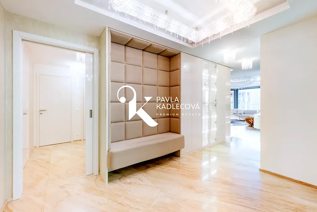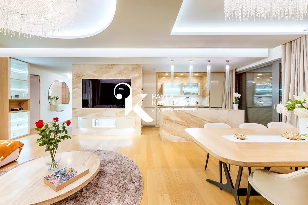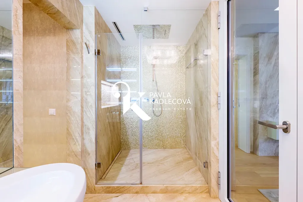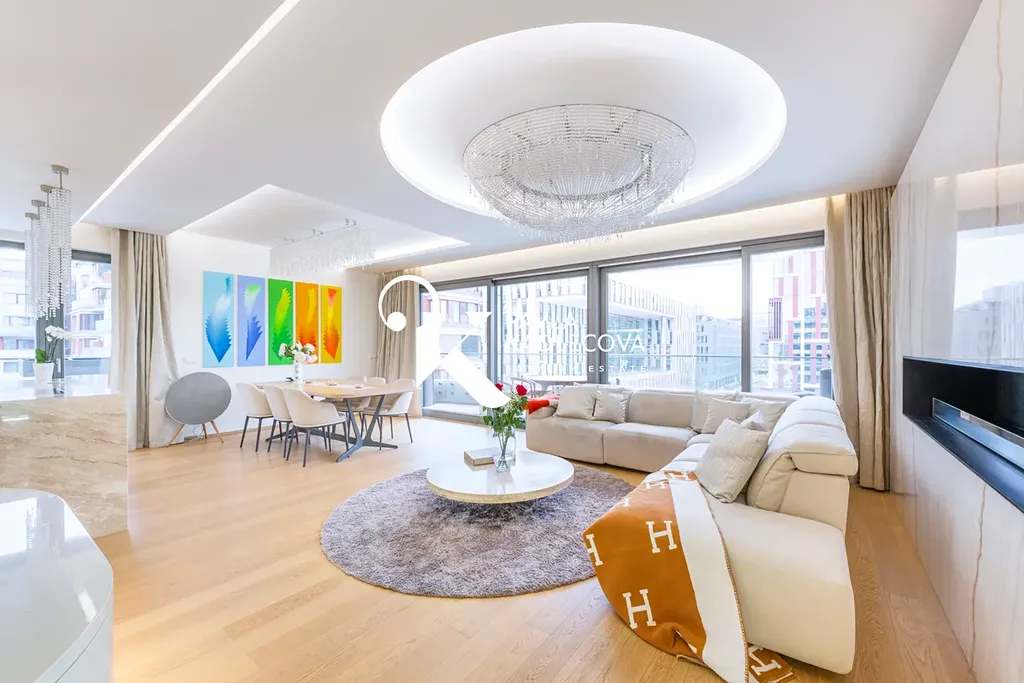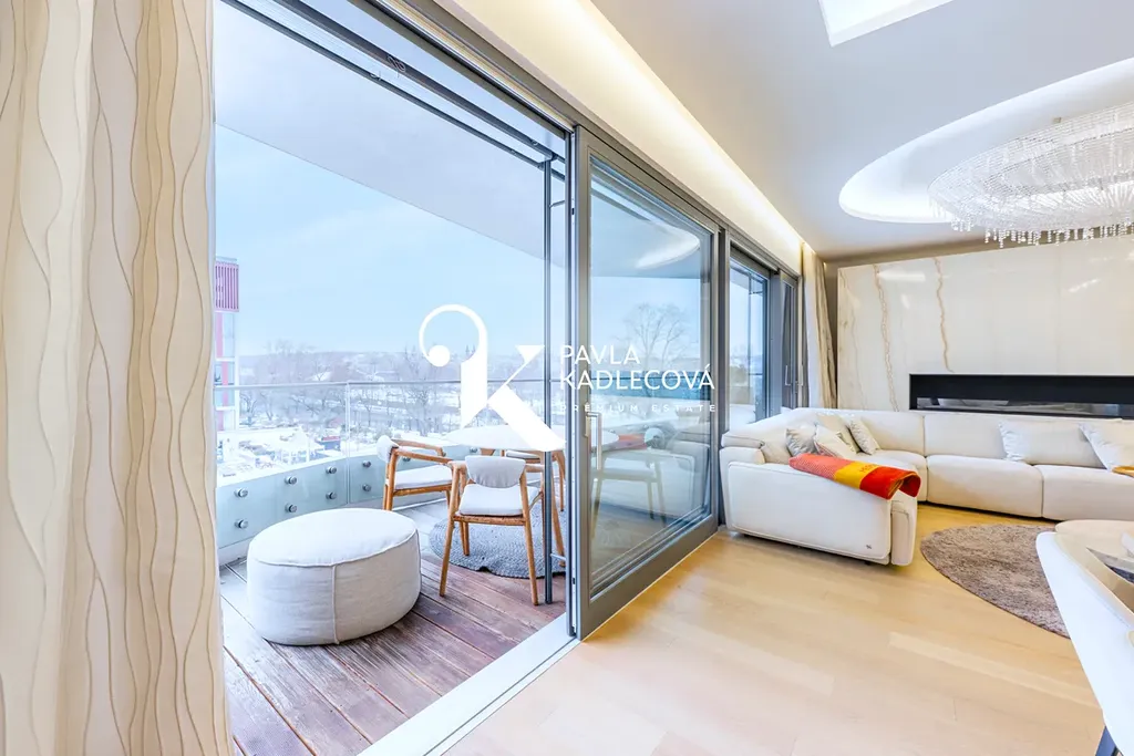 Dominantou bytu je otevřený obytný prostor s kuchyní, jídelnou a obývací částí, který je díky celoproskleným plochám zaplaven denním světlem a přirozeně se propojuje s terasami o celkové ploše 32 m². Kuchyň obložená mramorem je vybavena spotřebiči Miele, včetně vinotéky a plynule navazuje na designový/zakázkový jídelní stůl. Atmosféru prostoru dotváří podsvícená onyxová stěna s integrovaným parním krbem a promyšlené ambientní osvětlení. Celý obytný prostor je ideální jak pro každodenní rodinný život, tak pro společenská setkání.