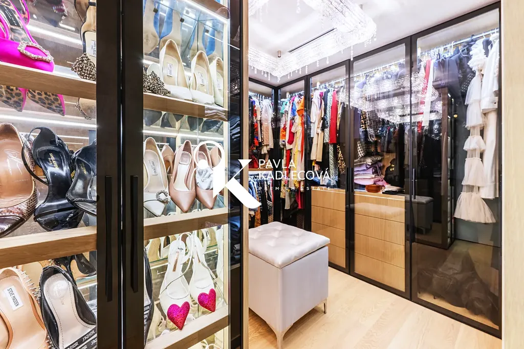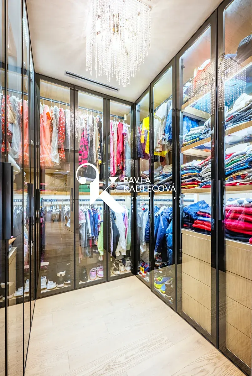 Při vstupu vás přivítá velkorysá hala s mramorovou podlahou, vestavěnými skříněmi, čalouněnou stěnou a decentně podsvícenými vitrínami pro umění či sběratelské předměty. Celý interiér byl navržen na míru s důrazem na harmonii, funkčnost a vizuální čistotu. Velkoformátový mramor, onyx, zakázkové truhlářské prvky a ikonická svítidla Lasvit vytvářejí sofistikované prostředí, které působí luxusně, ale zároveň klidně a nadčasově.
