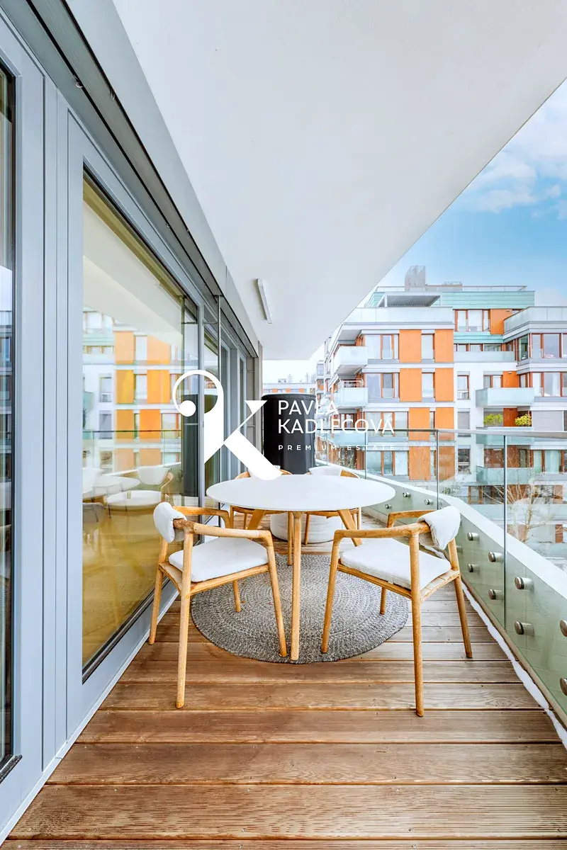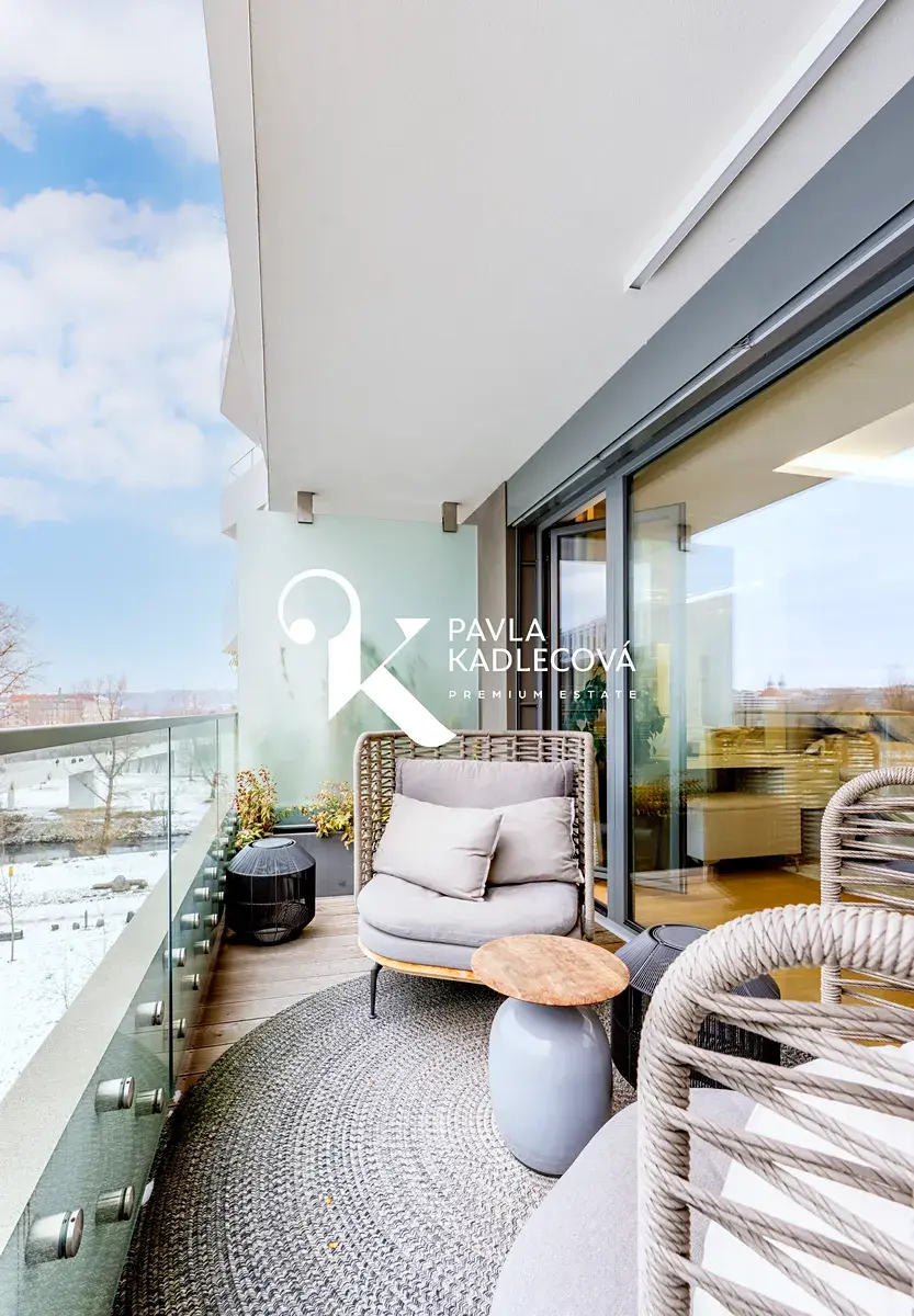 Rozsáhlá terasa, kompletně zařízená kvalitním a designovým venkovním nábytkem, je přístupná z hlavních obytných místností a nabízí jedinečné výhledy na Karlínský park, Vltavu, Holešovice, pěší lávku HolKa i pražské panorama. Vytváří ideální prostor pro ranní kávu, stolování pod širým nebem i večerní relax při západu slunce.