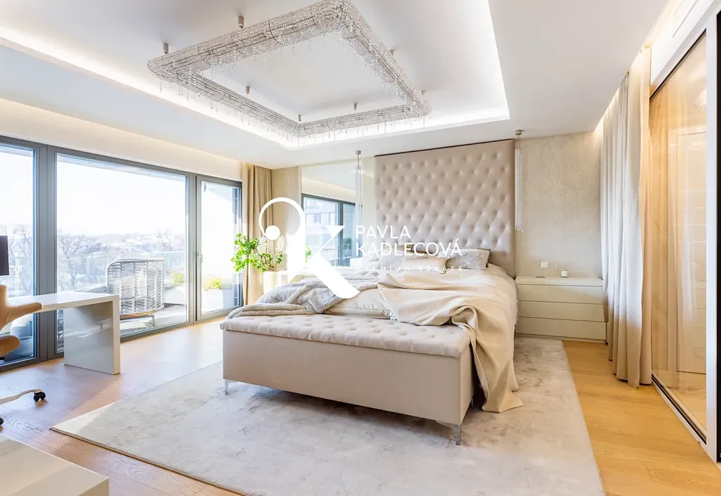 Hlavní ložnice nabízí naprosté soukromí a komfort. Prosklená stěna s přímým vstupem na terasu propojuje interiér s exteriérem a vytváří klidné místo pro odpočinek. Součástí ložnice je prostorná šatna a vlastní koupelna řešená ve spa stylu, s velkoformátovým mramorem, podsvícenou dešťovou sprchou, umyvadlem a separátní toaletou (inteligentní japonská toaleta značky TOTO). Vše je navrženo tak, aby podporovalo pocit klidu a pohody.