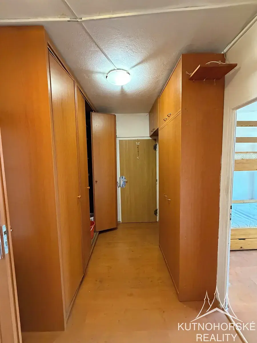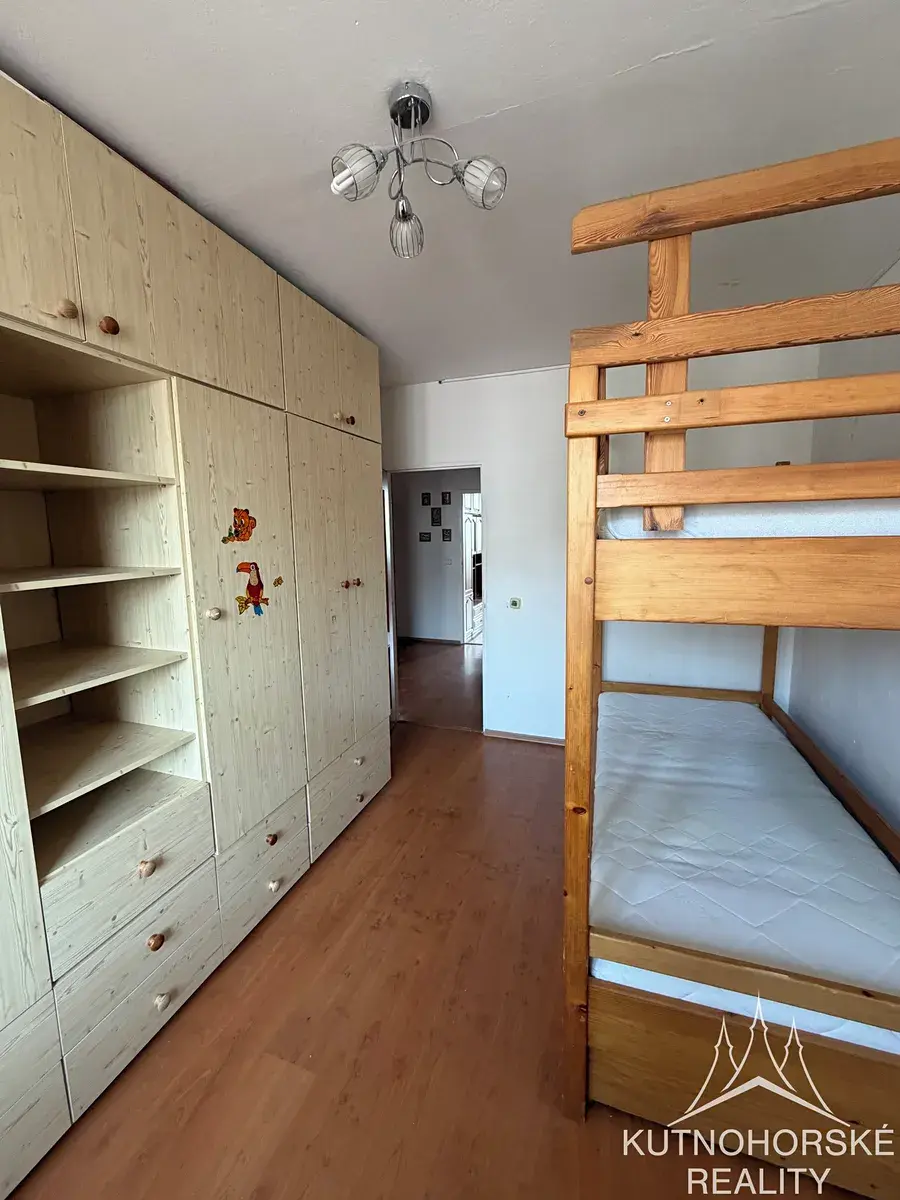 Byt se nachází v 6. patře panelového domu a je částečně vybaven (skříně, patrová postel).