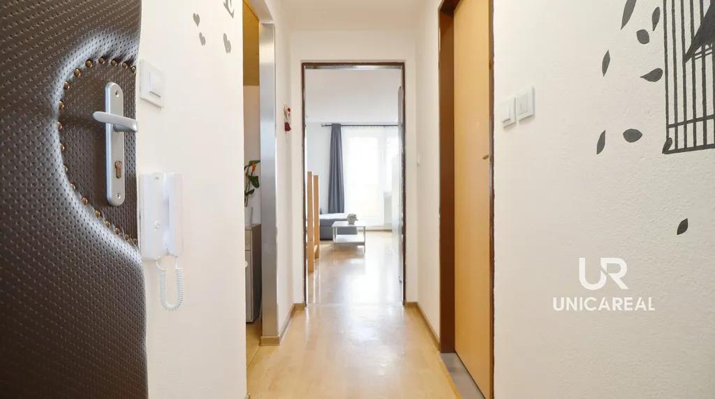 • Ze vstupní chodby je vpravo ložnice, vlevo kuchyňský kout propojený s obývacím pokojem, ze kterého je vstup na prosluněnou lodžii.