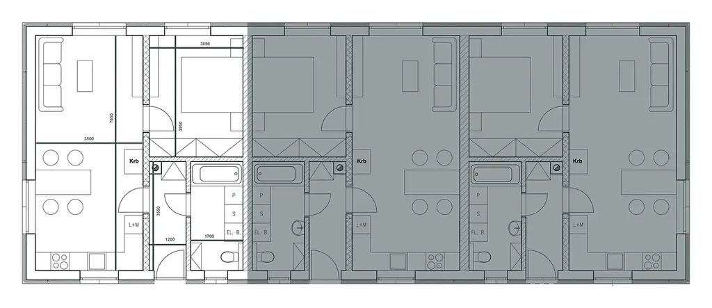 Dispozice 2x 2+kk: Dům obsahuje dvě identické, plně vybavené bytové jednotky se samostatnými vstupy.