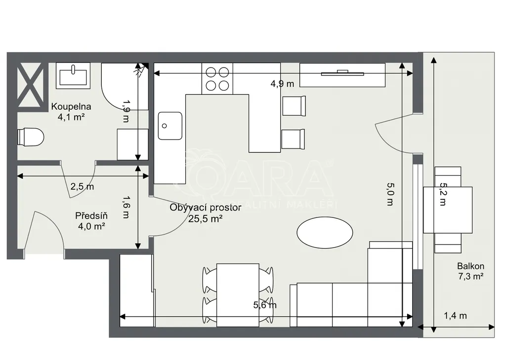 Obývací pokoj je propojen s kuchyňským koutem a nabízí rovněž přístup na prostorný balkon. Okna i balkon jsou orientovány na jihozápadní stranu.