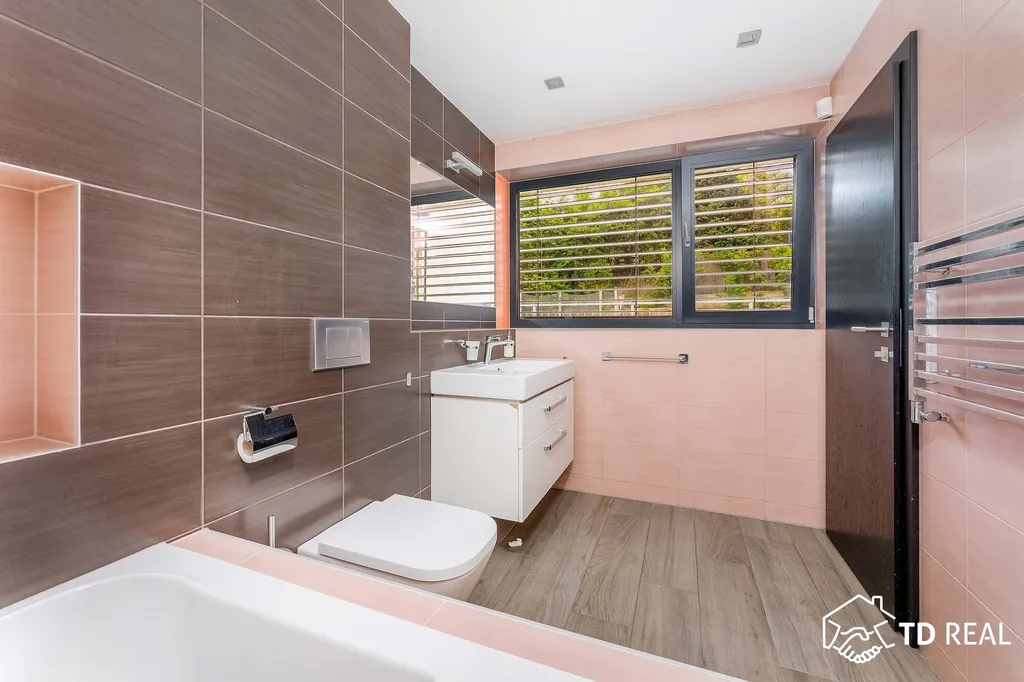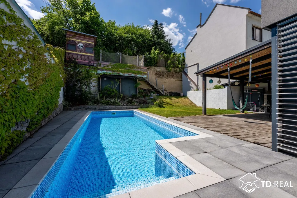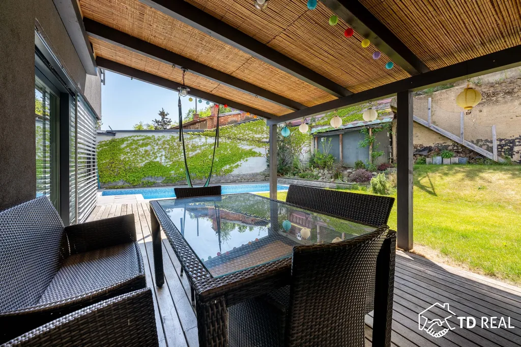 Zahrada s pergolou a grilem je perfektním místem pro relaxaci i letní grilování. Díky automatickému zavlažování se snadno udržuje. Bazén se slanou vodou a tepelným čerpadlem využijete už na jaře nebo na podzim při chladnějším počasí.