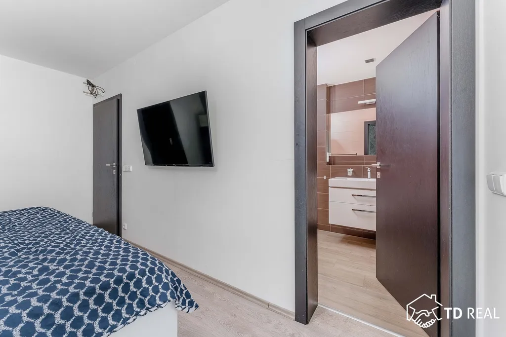 Ložnice (13 m²) je příjemně světlá a nabízí klidné místo pro odpočinek s vlastní šatnou a koupelnou. Dětské pokoje (12m² a 12 m²) oba tyto pokoje mají vlastní šatny a mají společnou koupelnu. Posilovna a bylo myšleno také na návštěvy, které svůj pokoj najdou v tomto patře, prostorná terasa.