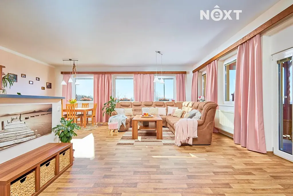 Interiér působí velmi světlým a vzdušným dojmem, zejména díky velkým oknům, která zajišťují dostatek denního světla po celý den. Dominantou domu je prostorný obývací pokoj propojený s kuchyňským koutem, který tvoří srdce domu. Z obytné části je přímý vstup na krytou terasu, kde se nachází venkovní krb, ideální pro posezení s rodinou či přáteli. Terasa nabízí příjemný výhled do okolí i směrem na panorama města a vrchol Kleť. Terasa je situovaná na západ. Máte-li rádi spíše jižní stranu, lze ji jednoduchou stavební úpravou rozšířit až na jih.