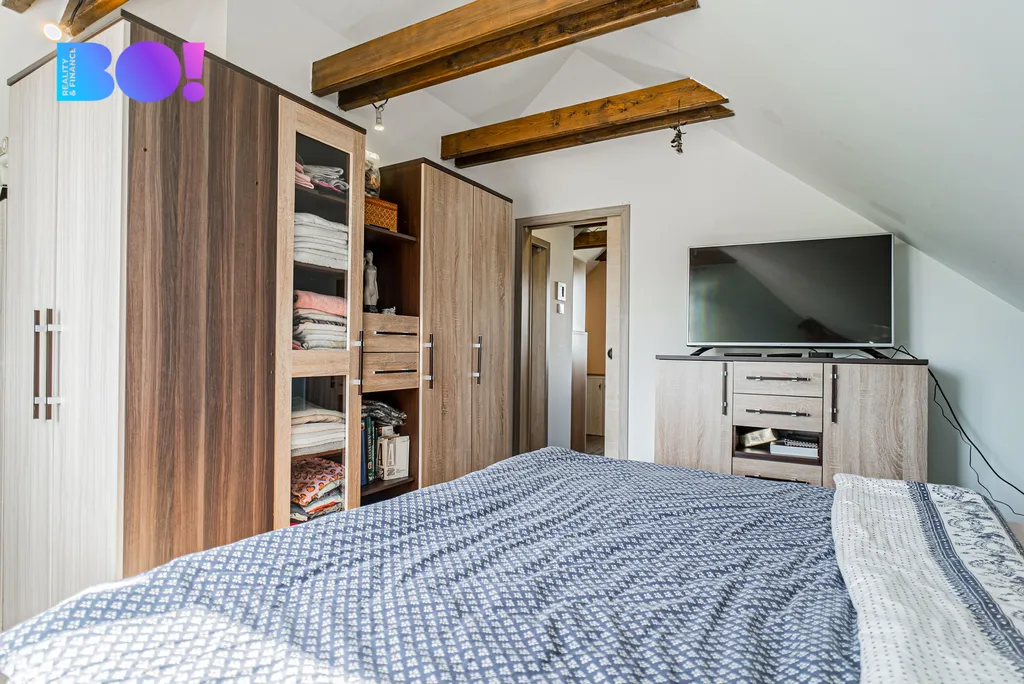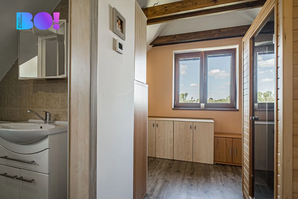 V horním patře je ložnice, otevřený pokoj/pracovna se šatnou a koupelna.