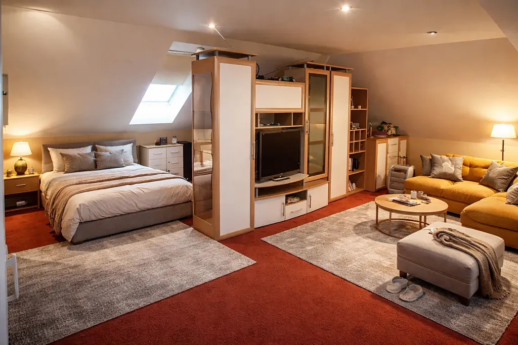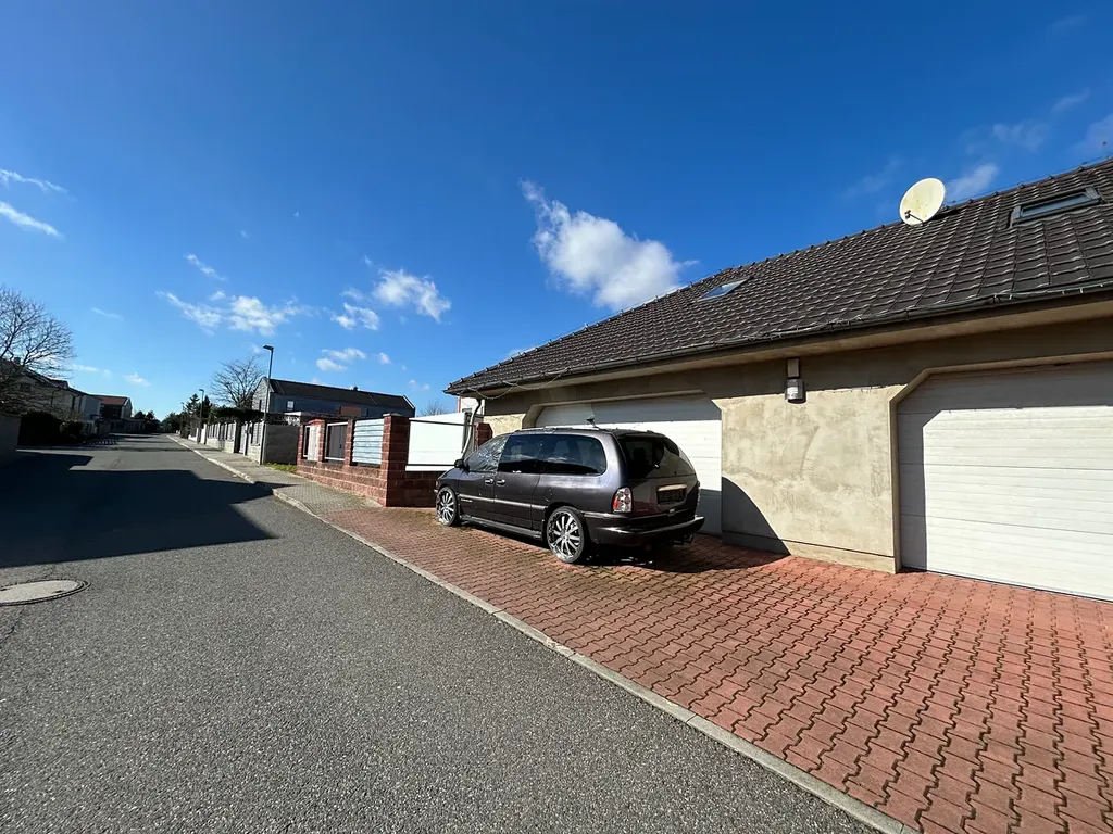 V přední části pozemku prodávané nemovitosti se nachází druhý menší objekt kde se nachází garáž (120 m2) pro 4–6 aut a patře obytný prostor pro hosty či podnikání (75 m2). Patro menšího domu dostavěno. Zde se nachází obývací pokoj s odděleným spacím koutem, kuchyň s kuchyňskou linkou, koupelna a chodba.