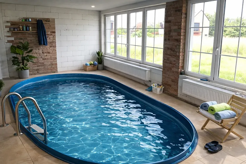Součástí domu je vnitřní bazén 3x6 m v místnosti 45 m2.