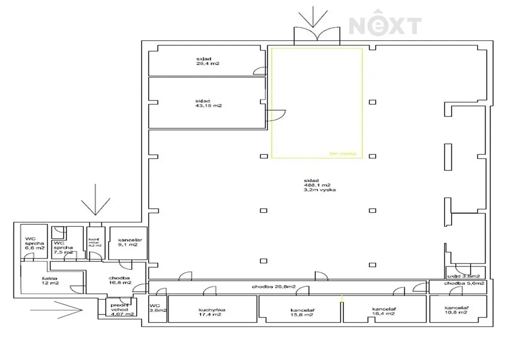Srdcem budovy je rozsáhlý hlavní skladovací prostor, který poskytuje dostatek místa pro skladování zboží, manipulaci s paletami, provoz regálových systémů nebo organizaci logistických procesů. Prostor je přístupný přes nájezdovou rampu a vrata, která umožňují pohodlný příjezd nákladních vozidel včetně kamionu – bez komplikací, bez zbytečných manévrů. Součástí skladu jsou dvě větší kancelářské místnosti, které lze využít přímo jako operativní zázemí pro vedoucí skladu, dispečery nebo administrativu spojenou s provozem.