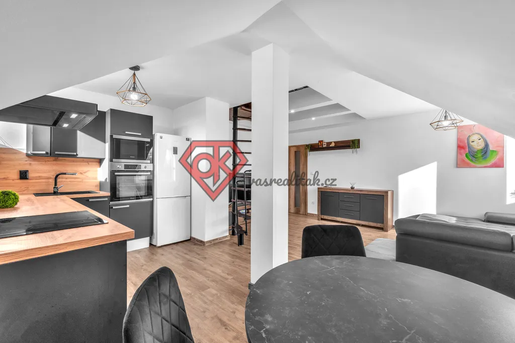 Byt o dispozici 2+kk s galerií nabízí otevřené spaní v patře, kam vás zavede elegantní schodiště přímo z obytné části. Celek působí vzdušně, moderně a přitom útulně. Jedná se o novostavbu cihlového domu a byt je ve skvělém stavu přímo k nastěhování. Nachází se ve 4. nadzemním podlaží domu s výtahem a jeho celková plocha činí 70 m².