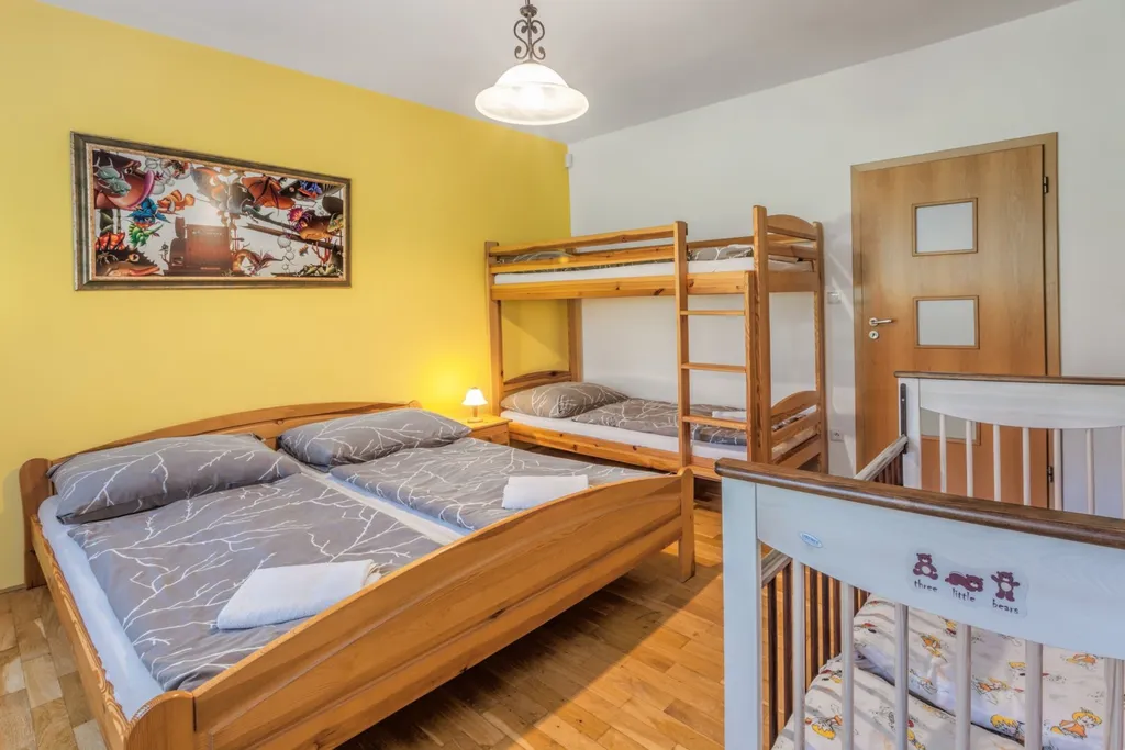 Dvou garáž – přízemí: parkování pro dva osobní automobily, wellness (sauna a sprchy), letní kuchyň, koupelna se sprchou a WC a posezení pod pergolou. Ve 2.NP je bytová jednotka 3+kk s celkovou plochou 57 m2.