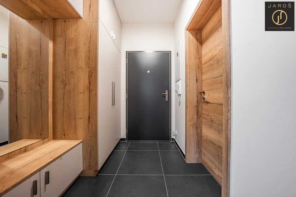Byt je navržen s důrazem na kvalitu a komfort. Podlahy jsou dřevěné, obývací pokoj je propojen s moderní kuchyní vybavenou vestavnou lednicí, myčkou, elektrickou troubou a indukční varnou deskou. V ložnici najdete prostornou vestavěnou skříň na míru, další úložné prostory nabízí chodba s vestavěnou skříní a botníkem. Koupelna je vybavena vanou.