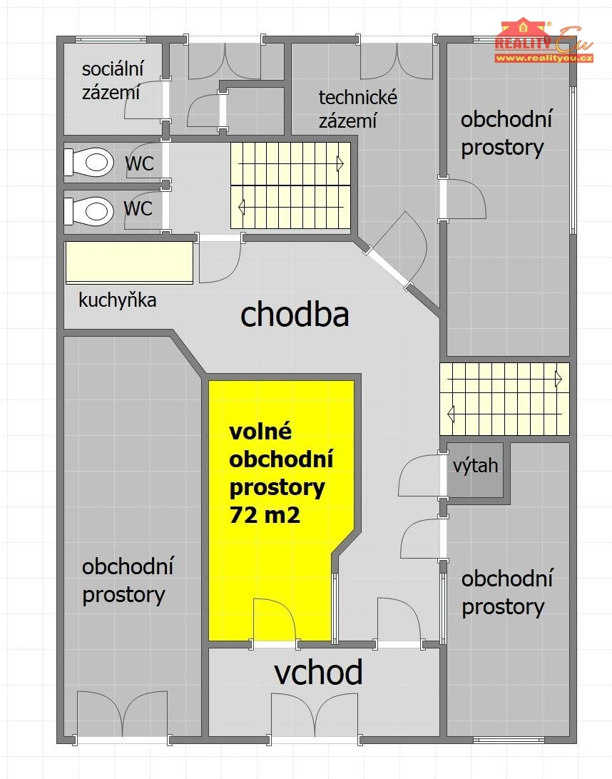 Velmi světlé obchodní prostory s vlastním vstupem o výměře 72 m². Umístěny jsou ve střední části u hlavního vchodu v 1 NP. Vhodné i jako kontaktní nebo prodejní místo pro silné společnosti s důrazem na vlastní prezentaci. V dalších podlažích budou k dispozici různě veliké kvalitní klimatizované kanceláře. V každém patře odpovídající sociální zázemí. Prostory lze ještě přizpůsobit na míru k požadavkům zákazníka. Vhodné pro silné společnosti hledající stabilní zázemí na dobré adrese, pohodlný přístup a rozsáhlé sebeprezentační možnosti pro své zákazníky. Parkování za objektem zajištěno. Pohodlí a bezpečí pro klienty umožňuje výtah a kamerový systém. Unikátně postavená budova nabízí zajímavé komerční nebo administrativní prostory moderního střihu s vysokým stupněm variability. Nájem je bez kauce a poplatků realitní kanceláře.