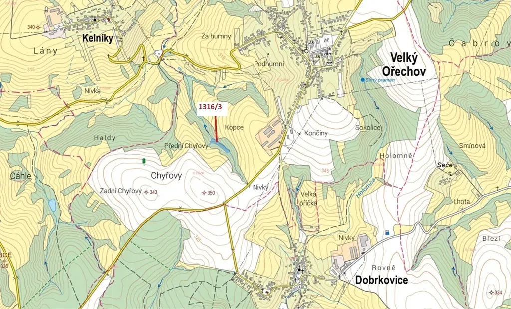 Lesní pozemek o výměře 5461 m2, parcelní číslo 1316/3, podíl 1/1, katastrální území Velký Ořechov, obec Velký Ořechov, obec s rozšířenou působností Zlín, okres Zlín, Zlínský kraj. Po těžbě.