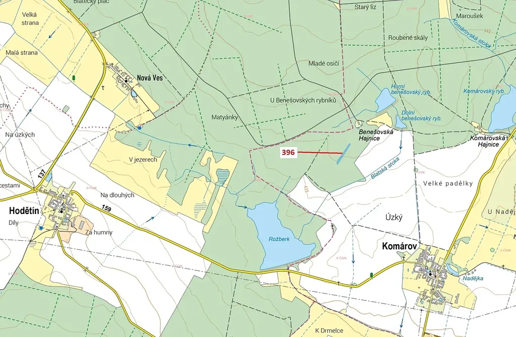 Lesní pozemek o výměře 3832 m2, parcelní číslo 396, podíl 1/1, katastrální území Komárov u Soběslavi, obec Komárov, obec s rozšířenou působností Soběslav, okres Tábor, Jihočeský kraj. Částečně po těžbě.
