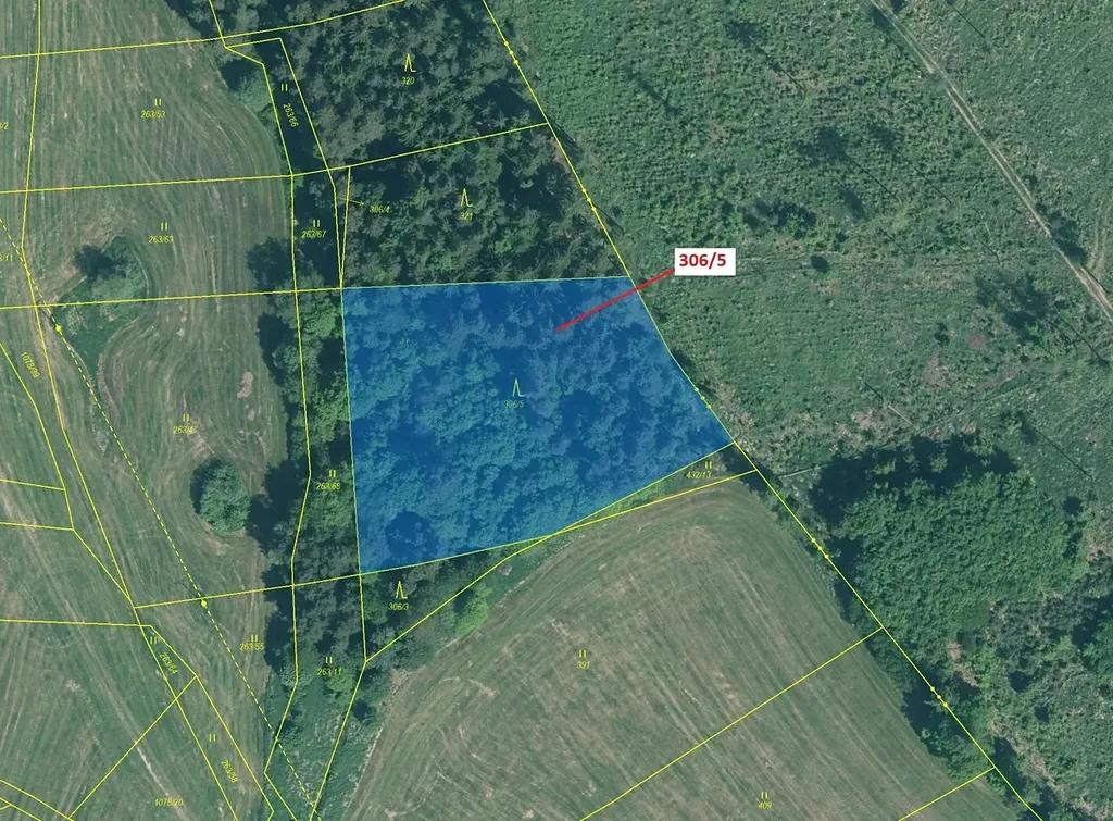 Lesní pozemek o výměře 4906 m2, parcelní číslo 306/5, podíl 1/1, katastrální území Třešně u Záhoří, obec Záhoří, obec s rozšířenou působností Písek, okres Písek, Jihočeský kraj. Částečně po těžbě.