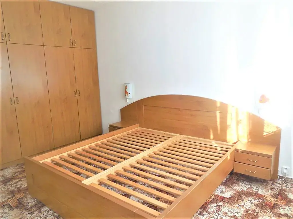 Dispoziční řešení: vstupní chodba, sam. WC, koupelna s vanou + pračka, šatna, kuchyň s jídelním koutem + kombinovaná lednice, obývací pokoj s výstupem na balkón, ložnice, pokoj, sklep. Velkou výhodou jsou úložné prostory v chodbě a vestavné skříně v ložnici .