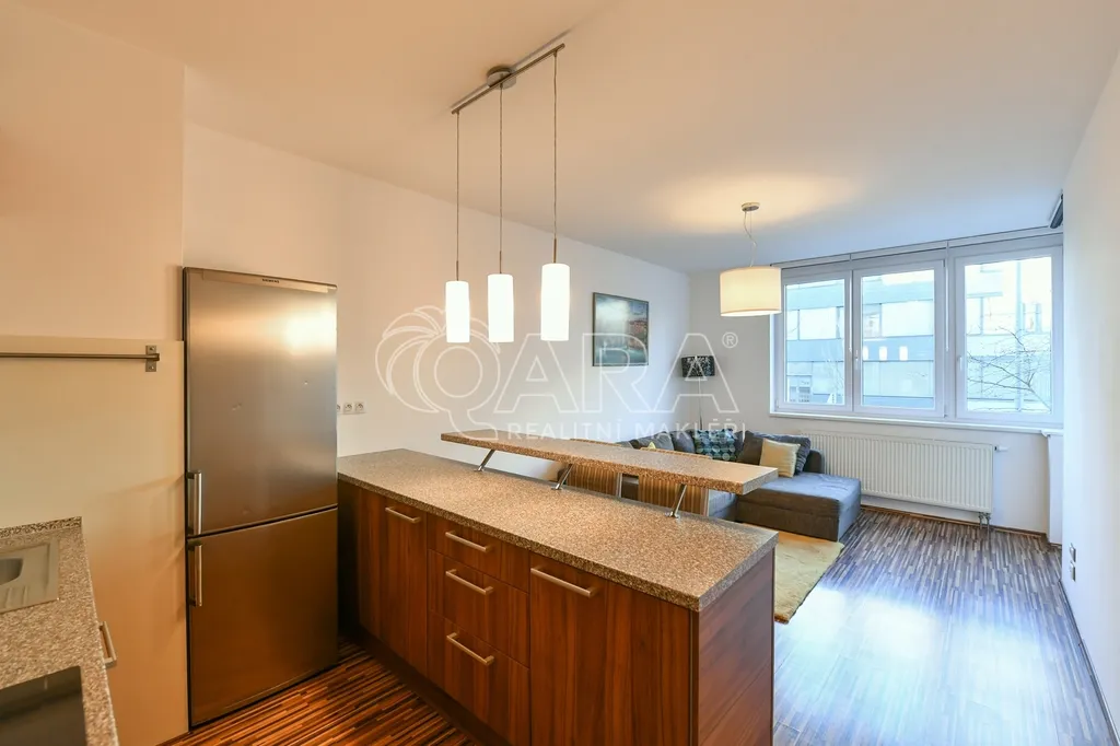 Byt sestává z předsíně (5,3 m2), obývacího pokoje s kuchyňským koutem (20,5 m2), ložnice (12,4 m2), koupelny s vanou a toaletou (5 m2), praktické komory (3,4 m2) a lodžie (3,6 m2). Z obývacího pokoje je pak vstup na lodžii. Kuchyně je plně vybavena vestavnými spotřebiči – myčkou, horkovzdušnou troubou, digestoří, varnou deskou a volně stojící lednicí. V ložnici instalována velkorysá vestavná skříň s dostatkem úložného prostoru. Obývací pokoj zařízen gaučem a konferenčním stolkem. Vytápění zajišťují radiátory s termostatickými hlavicemi.
