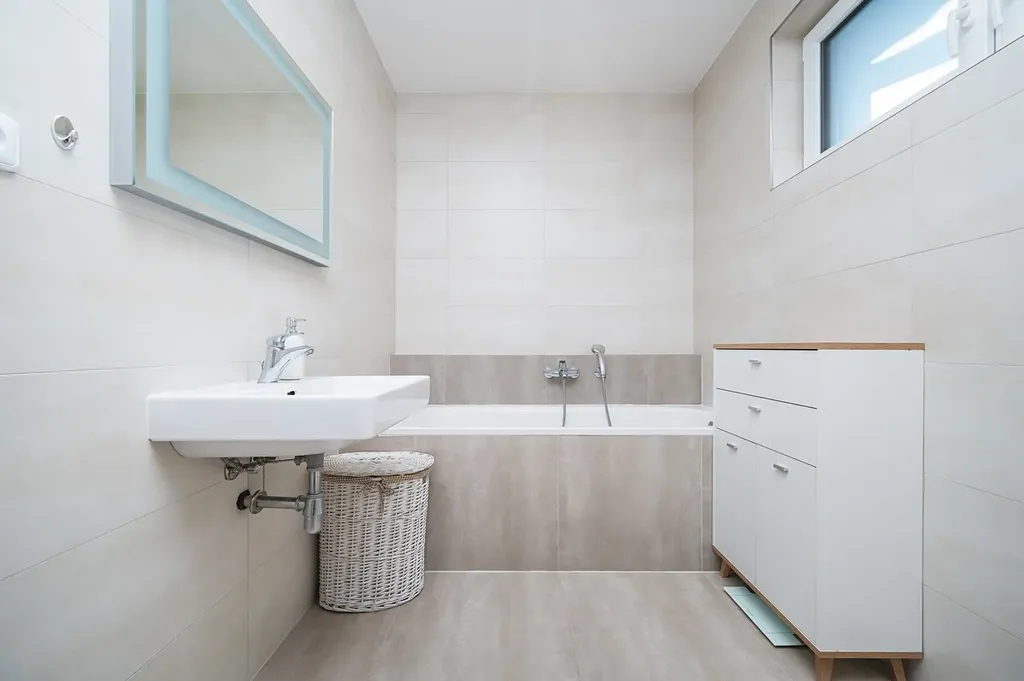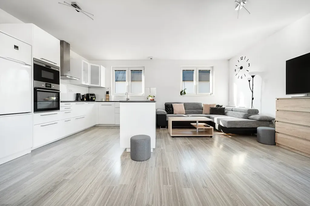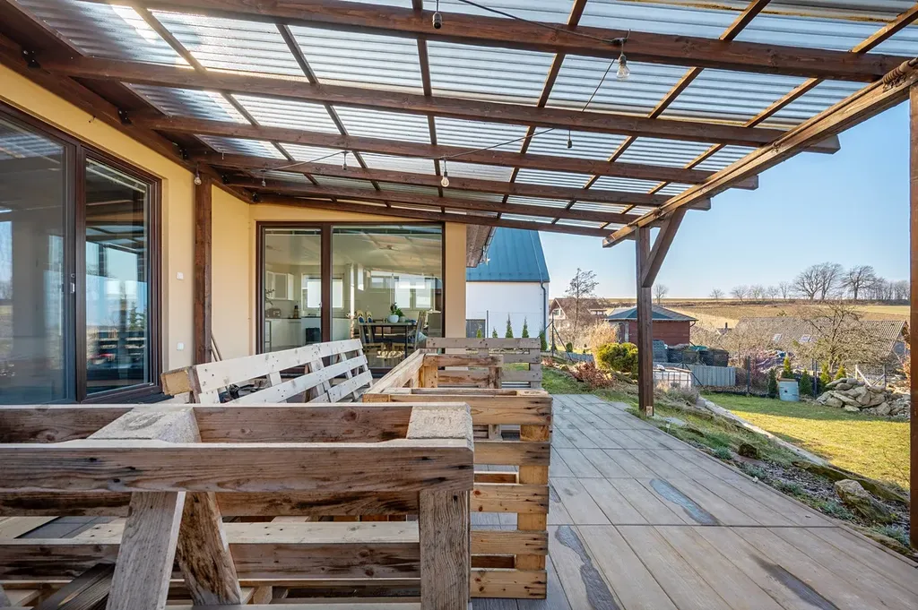 Interiér domu je vybaven vinylovými podlahami a plastovými okny s trojskly, včetně velkých francouzských oken, která zajišťují dostatek denního světla a přímý vstup na prostornou terasu s posezením orientovanou do zahrady.