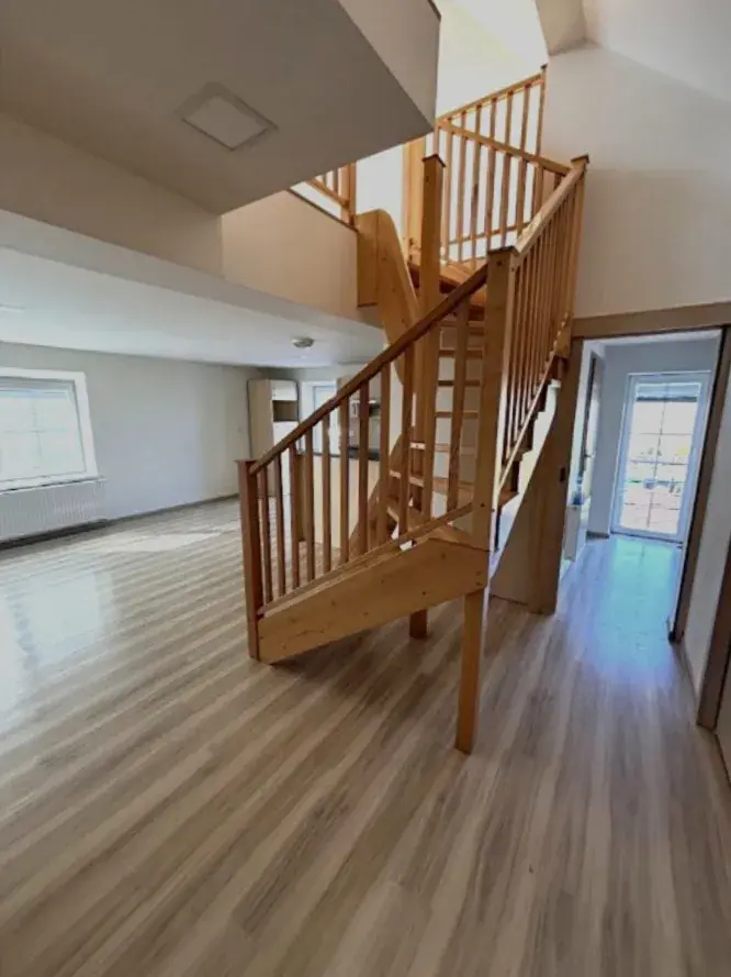 Elegantní masivní dřevěné schodiště vás zavede do hlavní obytné části: zde jsou dva neprůchozí pokoje, obývací pokoj propojený s kuchyní vybavenou elektrickou varnou deskou, troubou a přípravou na myčku.