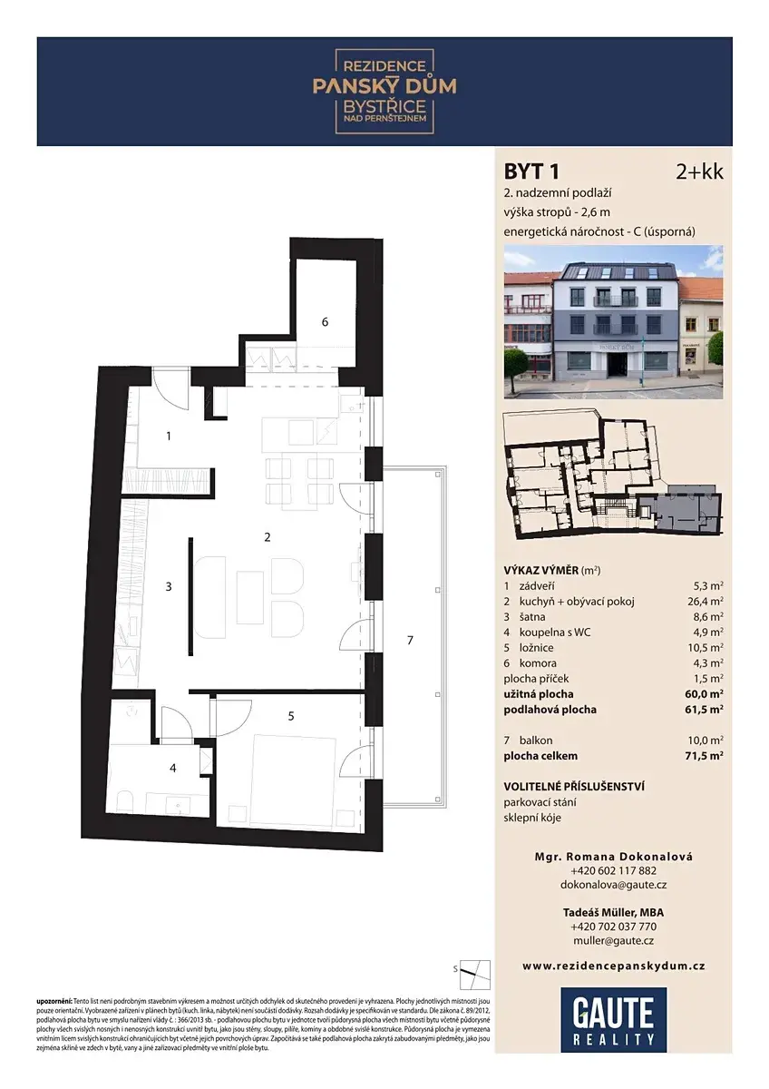 Jedná se o moderní bytovou jednotku s užitnou plochou 61,5 m², jejíž předností je velkorysý balkon o výměře 10 m², který je orientován do klidného vnitrobloku, na jihovýchodní stranu. Balkon je unikátní svou přístupností z celého bytu, což zajišťuje dokonalé propojení interiéru s venkovním prostorem. Nabízí tak soukromé místo pro odpočinek, stranou od ruchu náměstí, přičemž si zachovává veškeré výhody bydlení v historickém srdci města.