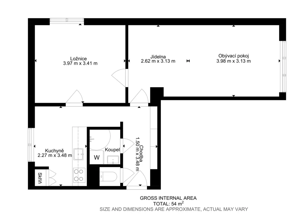 Dispozice bytu nabízí dva samostatné pokoje, samostatnou kuchyň, oddělenou koupelnu, WC a předsíň. Velkou výhodou jsou neprůchozí pokoje, které zajišťují dostatek soukromí a zároveň umožňují v případě investičního záměru pronájem bytu jako dvě samostatné místnosti. Kuchyně je situovaná do ulice Patočkova a pokoje do ulice Břevnovská.