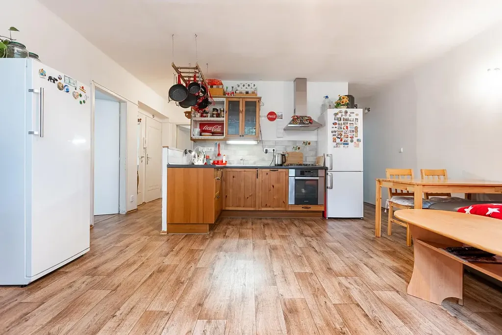 Velkou výhodou bytu je promyšlená a velmi funkční dispozice, kde jsou jednotlivé pokoje oddělené a samostatně přístupné, což zajišťuje dostatek soukromí pro každého člena domácnosti. Centrem bytu je prostorný a světlý obývací pokoj s kuchyňským koutem, který přirozeně slouží jako hlavní místo setkávání celé rodiny. Díky velkým oknům působí byt velmi vzdušně a příjemně.