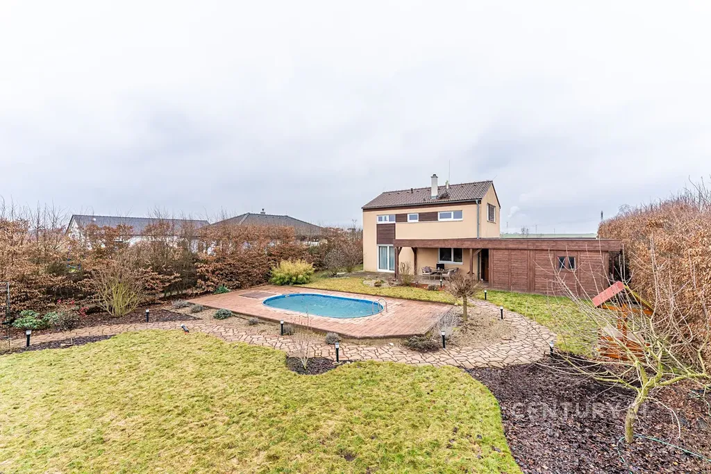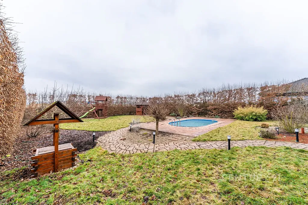 Bazén a terasa: Dominanta zahrady pro letní osvěžení a grilování.