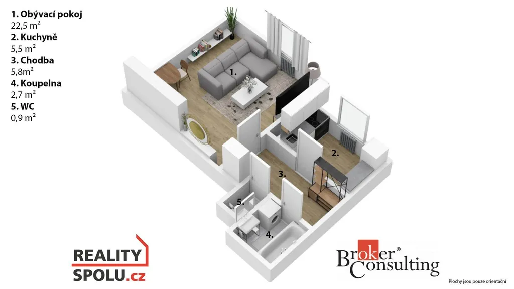 Byt o užitné ploše 37,4 m² se nachází v 1. nadzemním podlaží cihlového domu. Dispozice je prakticky řešena – prostorný obývací pokoj, samostatná kuchyně, koupelna, WC a vstupní chodba.