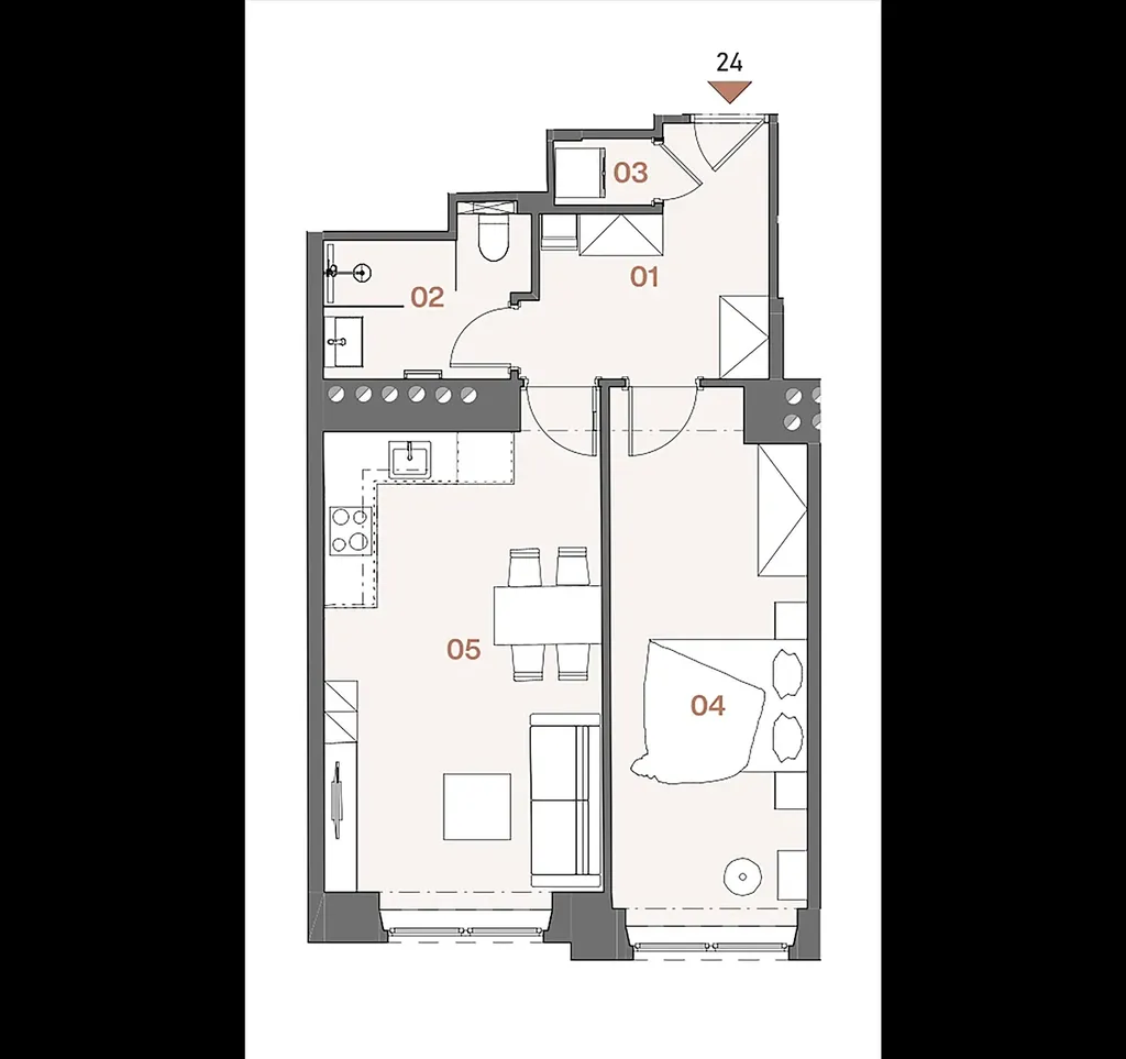 Půdorys bytu ve 2. podlaží zahrnuje obývací pokoj s přípravou na kuchyňskou linku, samostatnou ložnici, vstupní chodbu a koupelnu s toaletou. K jednotce náleží sklepní kóje, která poskytuje praktický úložný prostor navíc. Byt je dokončen v provedení fit out – s novou dřevěnou podlahou a nadčasovou koupelnou vybavenou sanitou značek Laufen a Grohe.