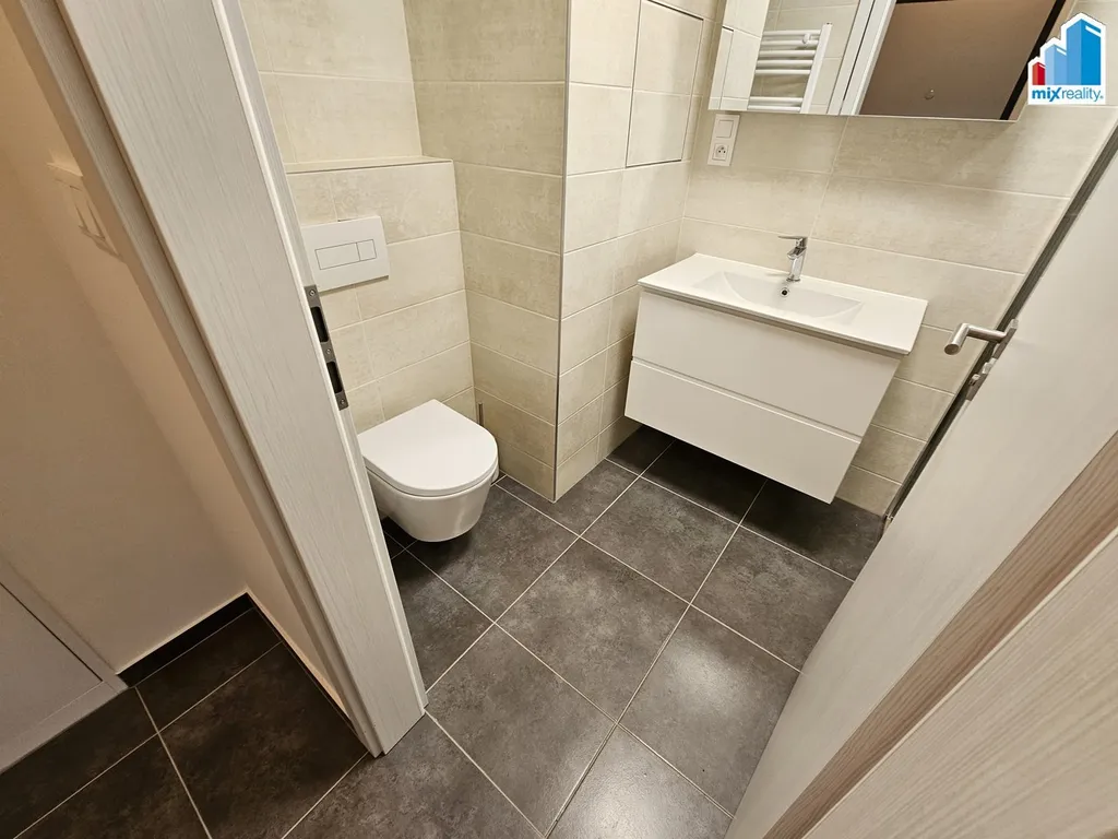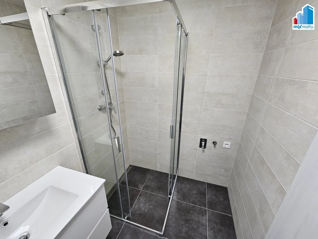 Moderně stylizovaná koupelna je vybavena sprchovým koutem, toaletní skříňkou se zrcadlem nad umyvadlem a praktickými úložnými šuplíky a přípojkou na pračku.