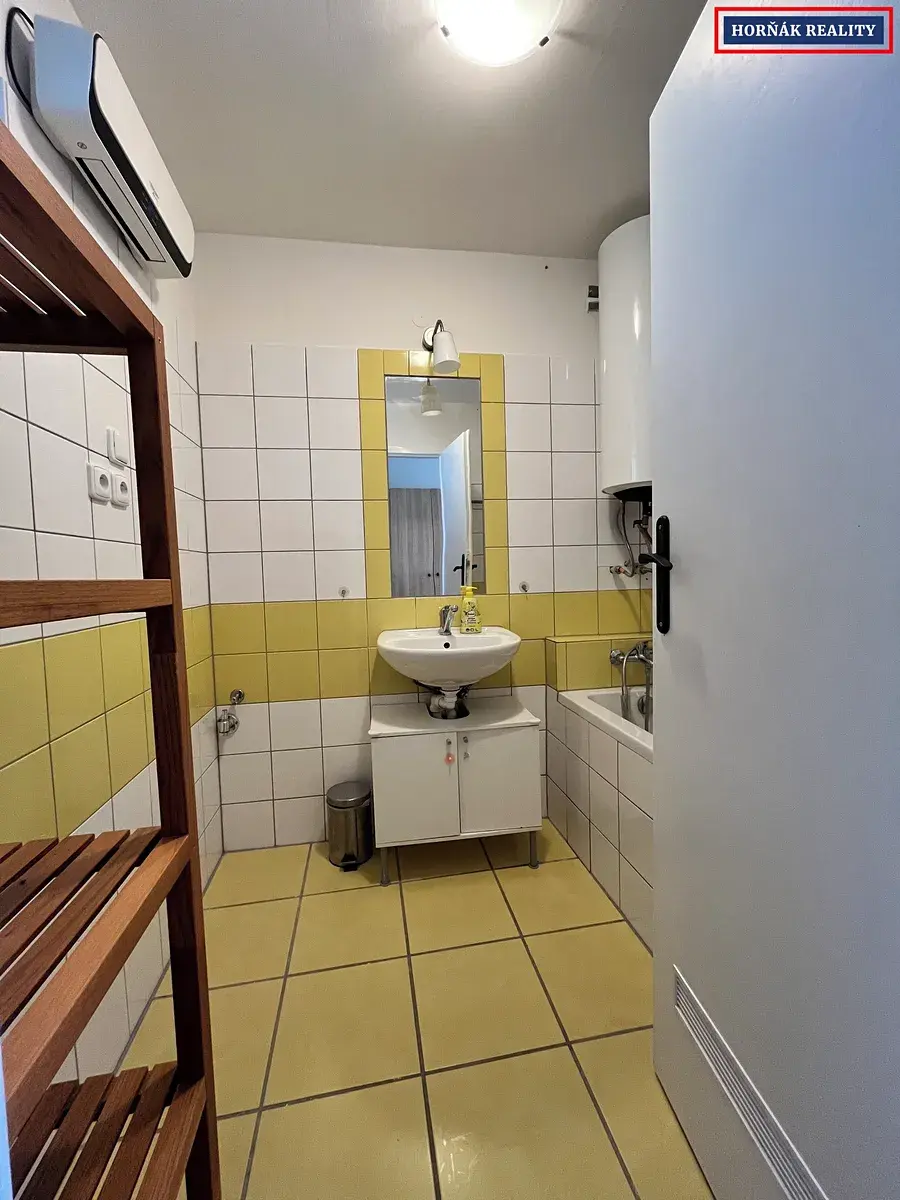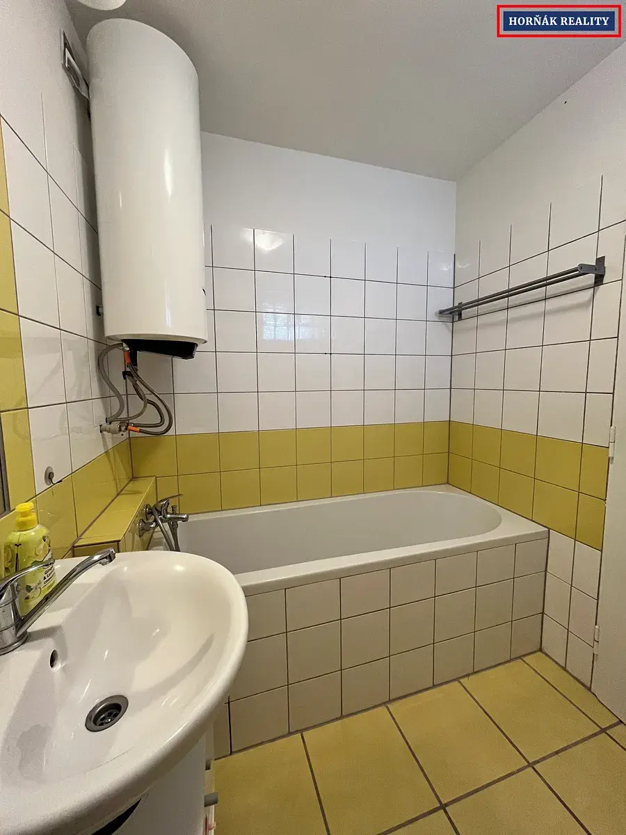 Dispozice bytu: vstupní chodba se šatní skříní, koupelna s vanou, samostatné WC, pokoj se skříní, obývací pokoj a kuchyně, která je vybavena myčkou, mikrovlnkou a jídelním stolem.