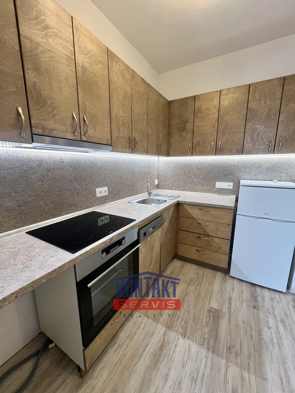 Dominantou bytu je prostorná kuchyňská část, která nabízí dostatek místa nejen pro vaření, ale i pro běžné fungování a posezení. Kuchyň je vybavena varnou deskou, troubou, myčkou nádobí a lednicí s mrazákem. Nechybí ani dostatek úložného prostoru. Vybaveno také pračkou.