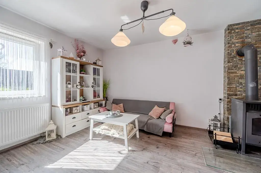 Předsíň. koupelna s vanou a WC, spíž, dva neprůchozí pokoje (15 m a 17 m), obývací pokoj s kuchyňským koutem, vstup na pochozí půdu s možností vestavby (1 větší nebo 2 menší pokoje). Díky půdnímu prostoru je zde potenciál pro rozšíření obytné části dle vašich potřeb.