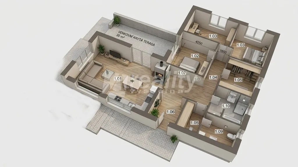 Celý dům je zateplený polystyrenem a zateplení stropu je zajištěno foukanou izolací. U všech oken je nachystaná kompletní příprava na instalaci venkovních žaluzií. Součástí novostavby je i zastřešená terasa o velikosti 50 m2.