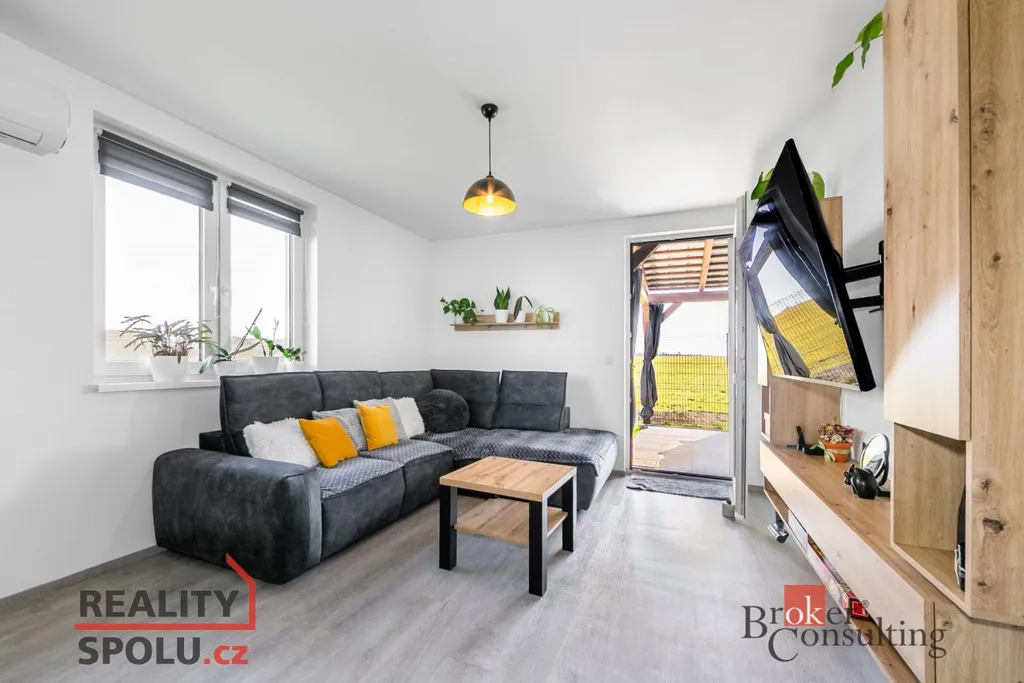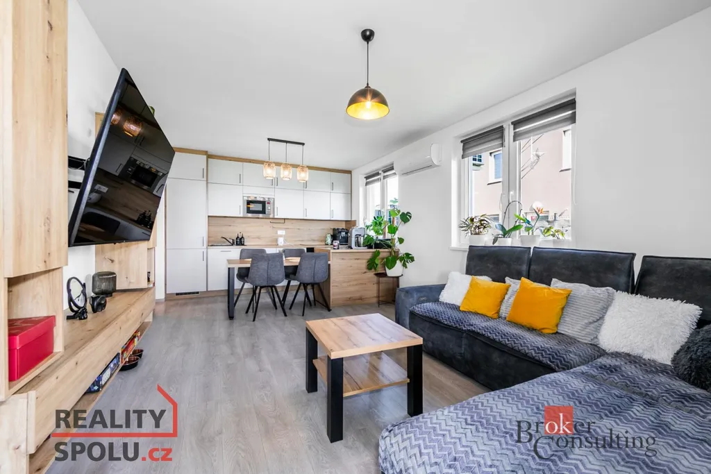 Přízemí tvoří otevřený obývací pokoj propojený s jídelnou a plně vybavenou kuchyní. Součástí bytu jsou dvě koupelny, z nichž jedna disponuje sprchovým koutem a prostorem pro pračku. Celková užitná plocha činí 79 m². Nemovitost je technologicky výborně vybavená a nabízí velmi nízké provozní náklady. Na střeše je instalována fotovoltaika, v pokojích umístěných v horním patře jsou zabudované stropní topné panely. V obou koupelnách a ve zbytku bytu je poté vytápění zajištěno topnými kabely v podlaze. Teplotní komfort v létě naopak řeší klimatizační jednotky umístěné v obytné části a v ložnici.