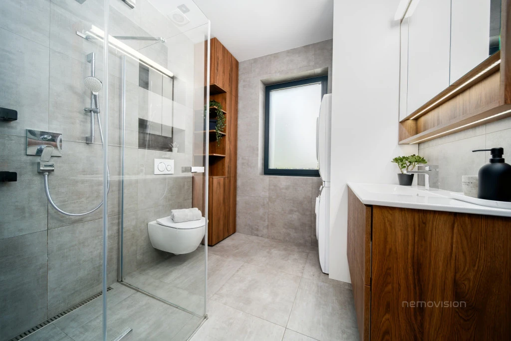 Interiér bytu je světlý a vzdušný, díky velkým oknům je celý prostor přirozeně prosvětlený. Moderní vybavení, kvalitní materiály a podlahové vytápění vytvářejí komfortní prostředí pro každodenní život. Dispozice bytu je navržena tak, aby poskytovala dostatek prostoru jak pro rodinné bydlení, tak i pro klidné zázemí pro práci z domova.