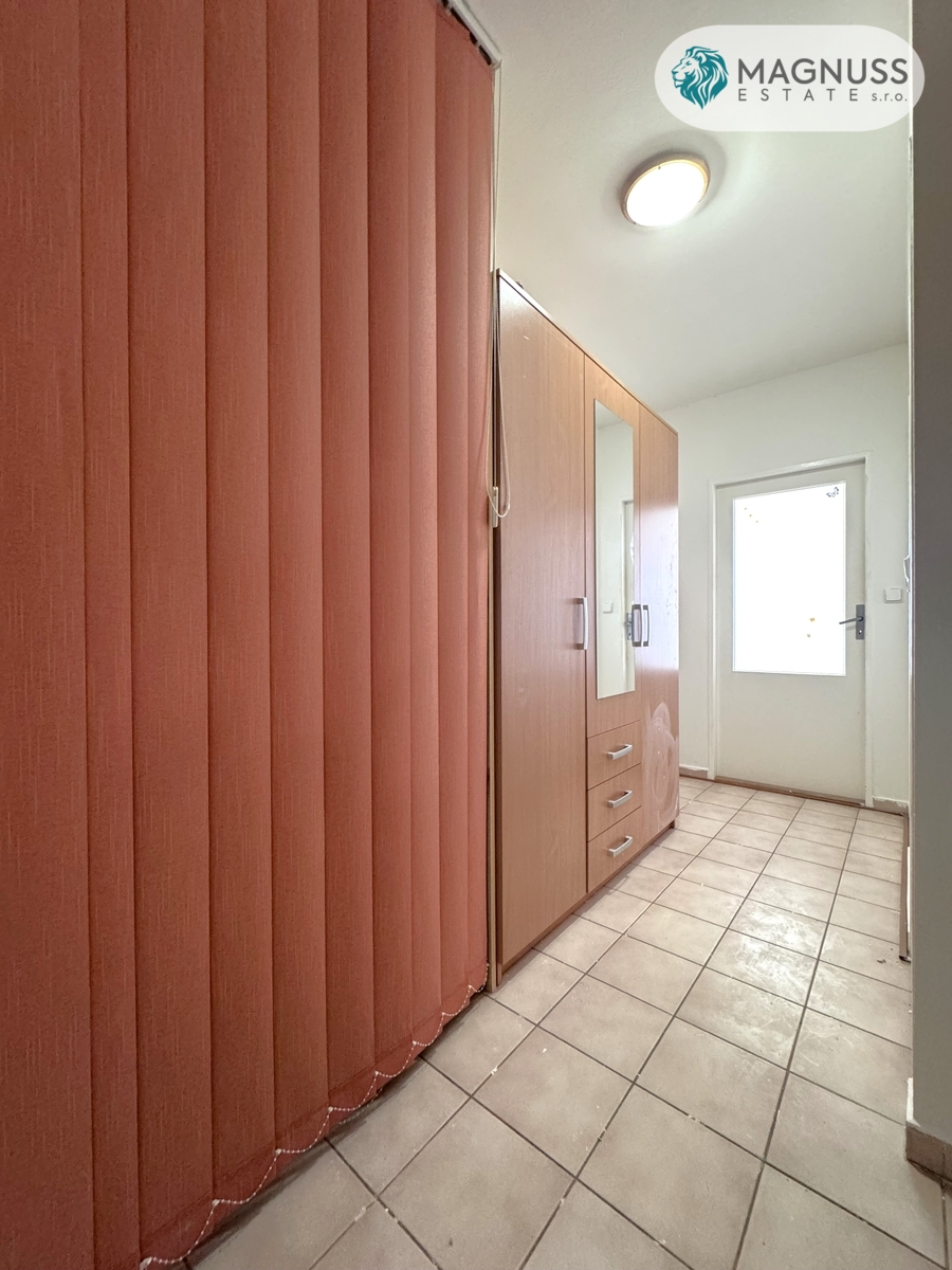 Dispozice bytu nabízí dvě samostatné místnosti – obytný pokoj a kuchyň s jídelním prostorem, ze které je přímý vstup na balkon. Součástí bytu je také prostorná předsíň, koupelna s vanou a samostatné WC. Velkou výhodou jsou velmi nízké provozní náklady.