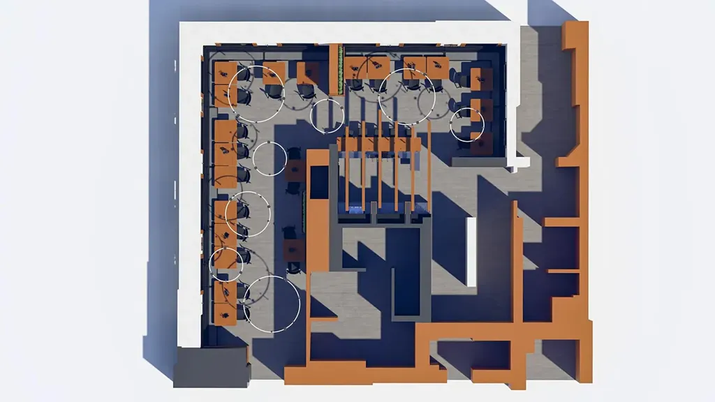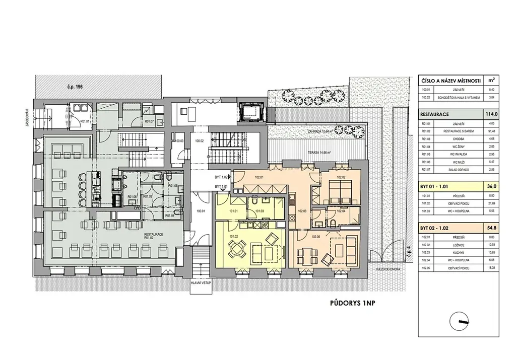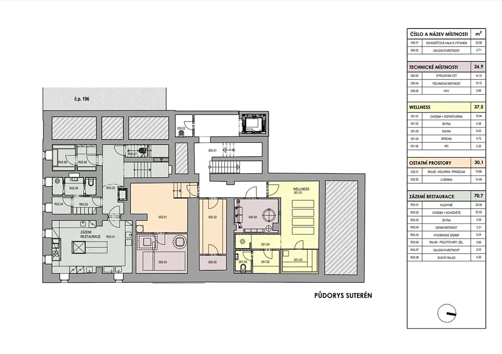 V přízemí objektu vznikne prostor pro restauraci se zázemím pro hosty o celkové výměře 132,7 m2. O patro níže vznikne kuchyně a zázemí restaurace pro personál o celkové výměře 76 m2. Připravena šachta na zdviž z kuchyně do restaurace pro snadnější obsluhu.