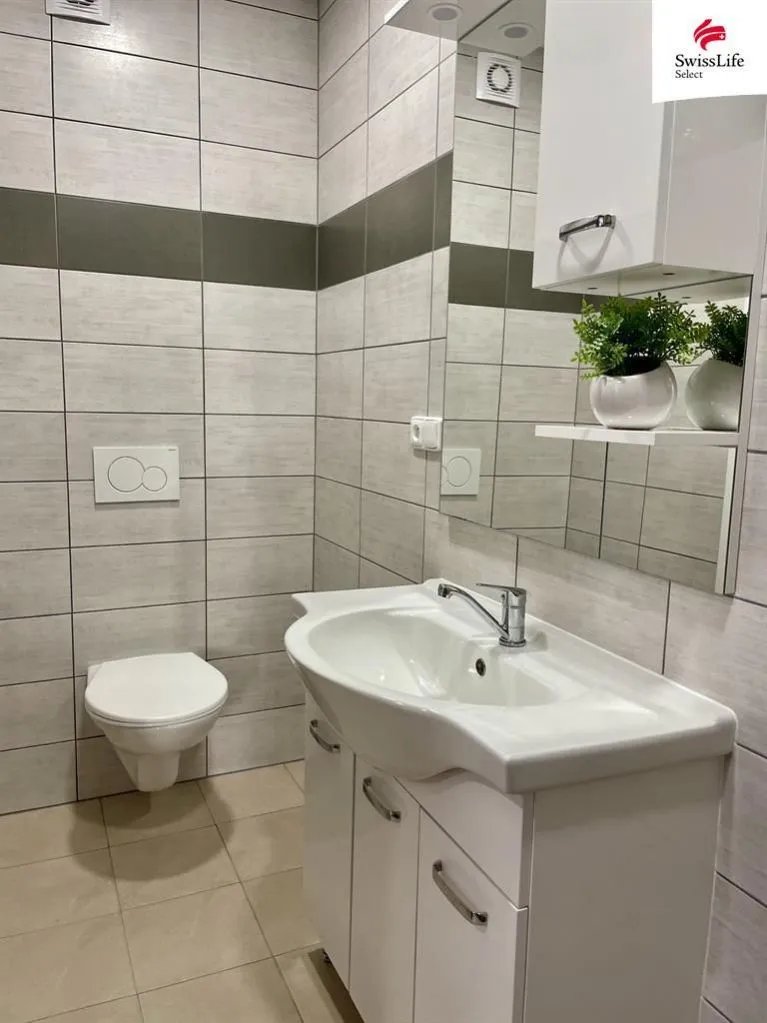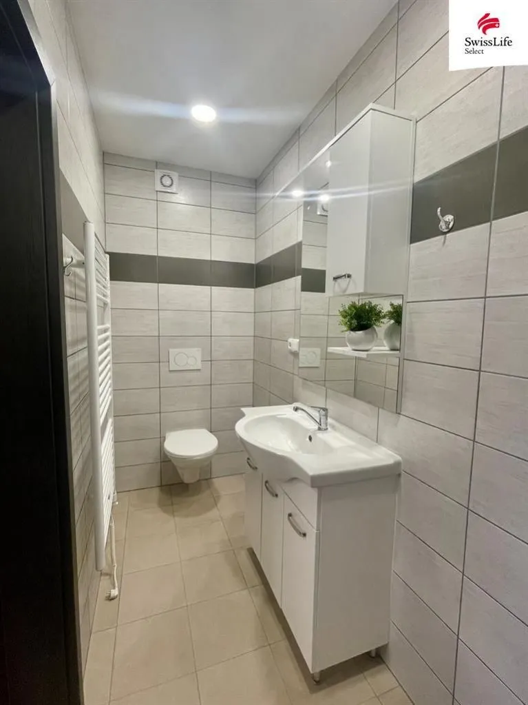 Vedle kuchyně je atraktivní koupelna s velkorysým sprchovým koutem a toaletou. Vše je příjemně barevné, nové a komfortní.