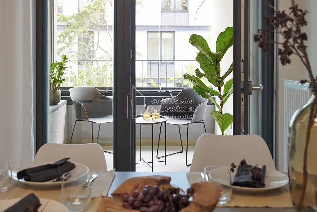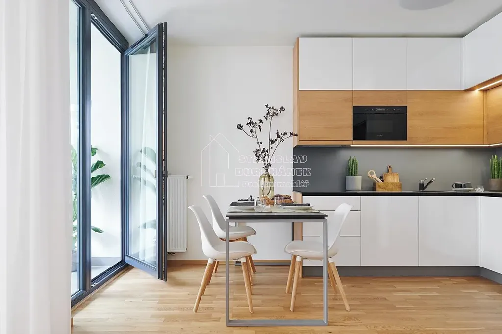 Byt bude pronajímán jako vybavený nábytkem i spotřebiči - velká skříňová stěna v obývacím pokoji, pohovka s úložným prostorem, sklopná dvojpostel (200 x 180 cm) se zdravotní matrací, stůl, židle, v kuchyni pak rohová kuchyňská linka včetně vestavěných spotřebičů (lednička, mrazák, myčka, indukční varná deska, digestoř, mikrovlnná trouba s funkcí grilu). V komoře je poté pračka se sušičkou (v jednom). Koupelna je se sprchovým koutem a WC.